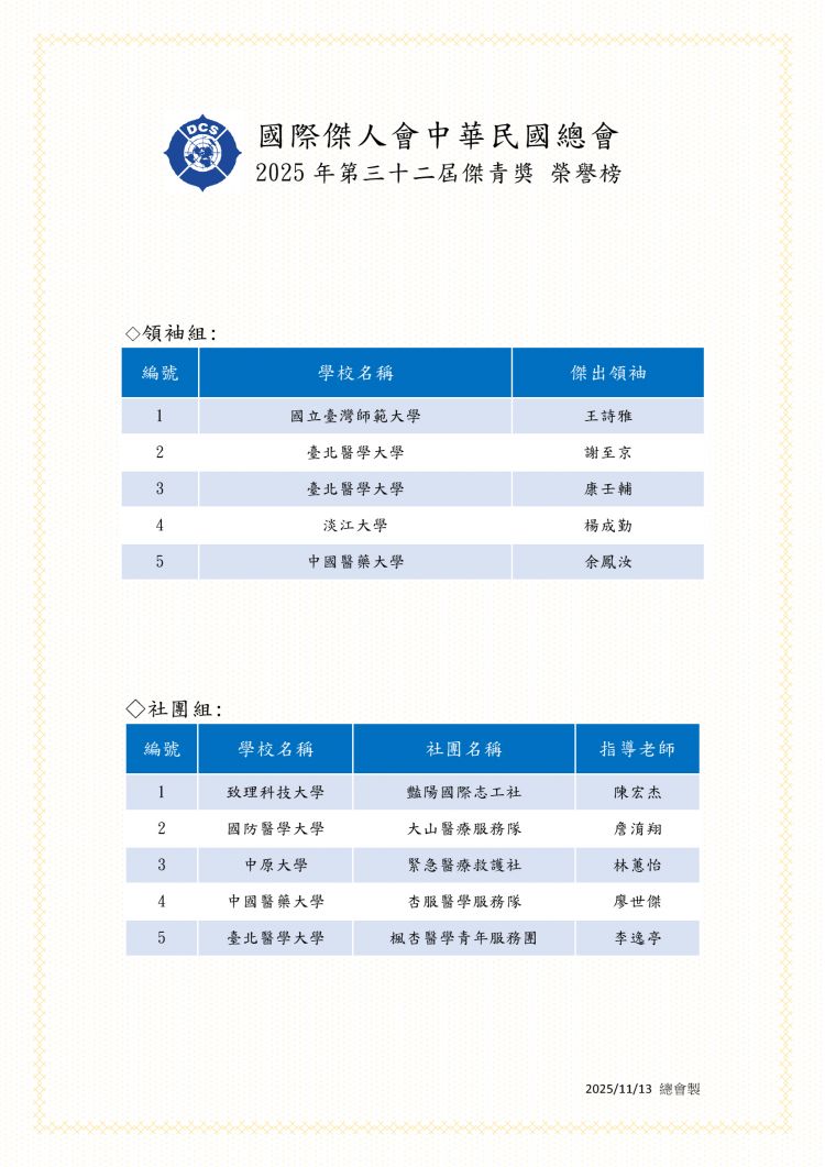 2025年第32屆傑青獎榮譽榜