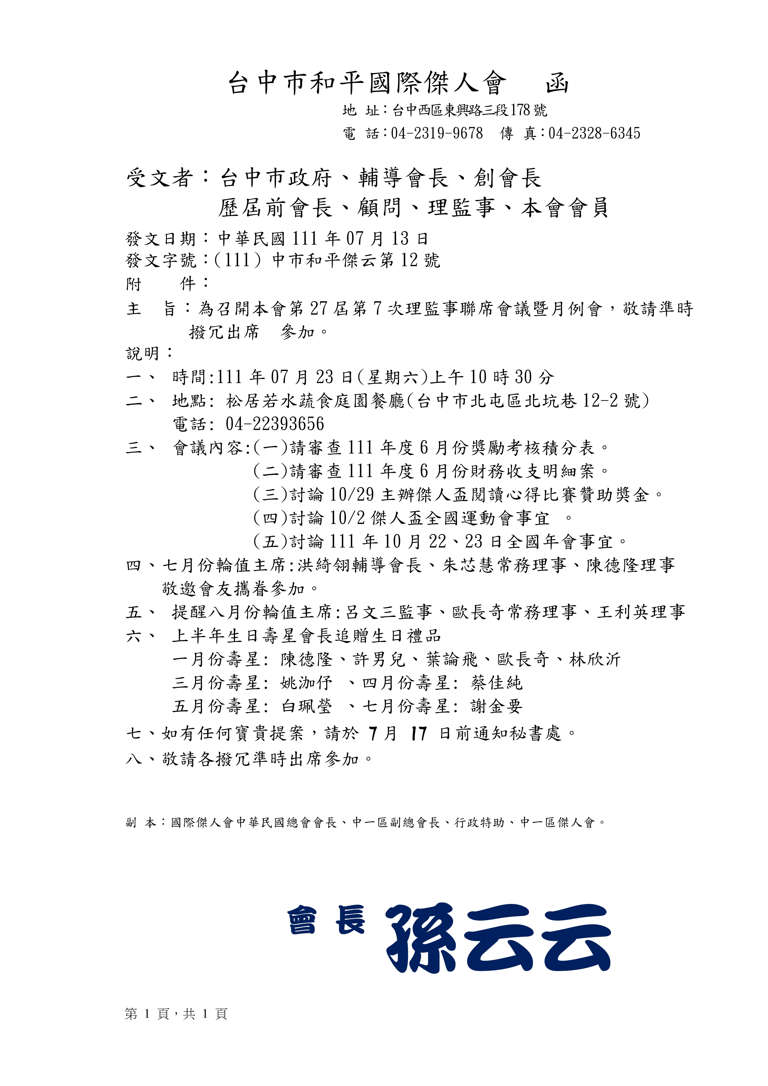 2022.07.23(六) 第27屆第7次理、監事聯席會議